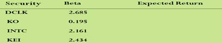 risk high return, but which risk?) 10. Consider the previous example with the following four securities: Security Weight Beta DCLK .133 2.685 KO .2 0.195 INTC .267 2.161 KEI .4 2.434 What is the portfolio beta? 11. The above is the SML
